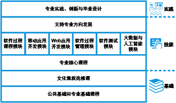 专业学习内容从基础、技能、实践三方面入手,如图1所示,旨在培养具有良好的知识结构、较高的素质结构、较强的能力结构和创新精神,能从事软件工程开发和研究的高层次、实用型、复合型、具有国际竞争力的专门人才。