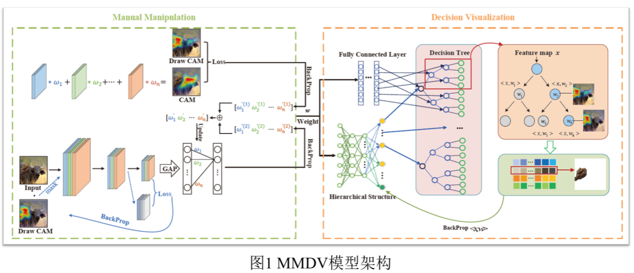 Aiming at the problem that the depth neural network model is opaque and cannot be explained, this paper constructs a method of manual manipulation and decision visualization (MMDV):; 2) A hierarchical learning mechanism with a sequential decision tree is proposed to provide a decision path for the full connection layer of the network with strong interpretability; 3) A new interpretability evaluation standard DMR is proposed to evaluate the interpretability of data, models and results. The proposed method can enhance the network comprehensibility of man in the loop and the interpretability of the model results, which lays an academic foundation for opening the "black box" model of in-depth learning and applying it to high-risk decision-making fields in the future.
